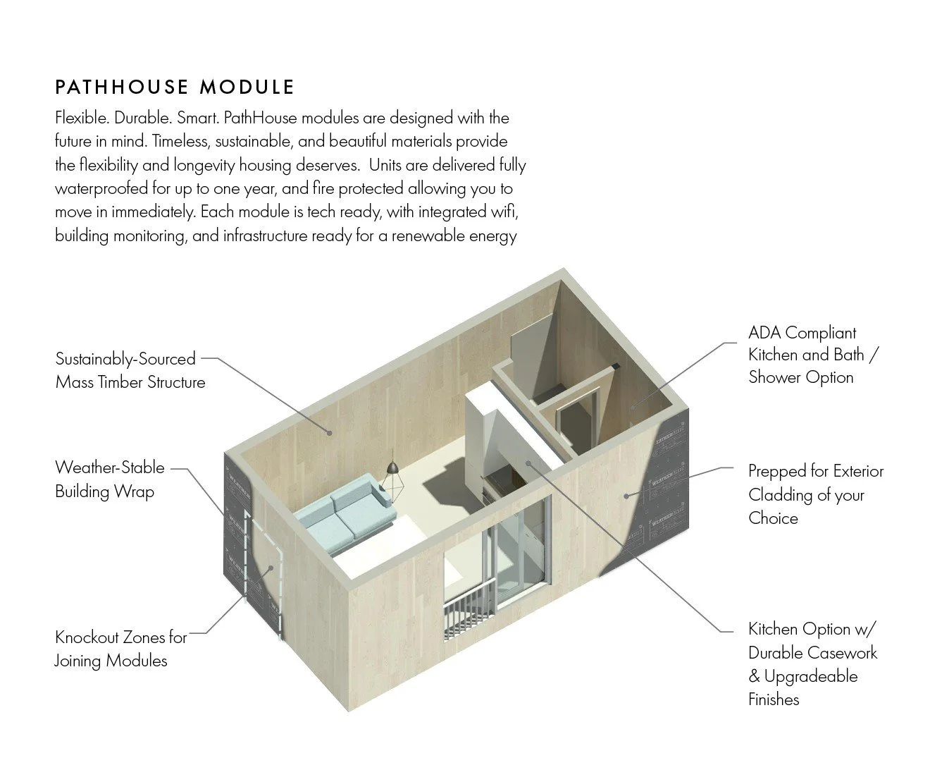 PathHouse is a high-volume, volumetric modular housing factory that uses carbon sequestering mass-timber products for the units’ shell and structure. The factory is capable of producing 50,000 standardized housing modules per year at a price point 10-20% below market rate.